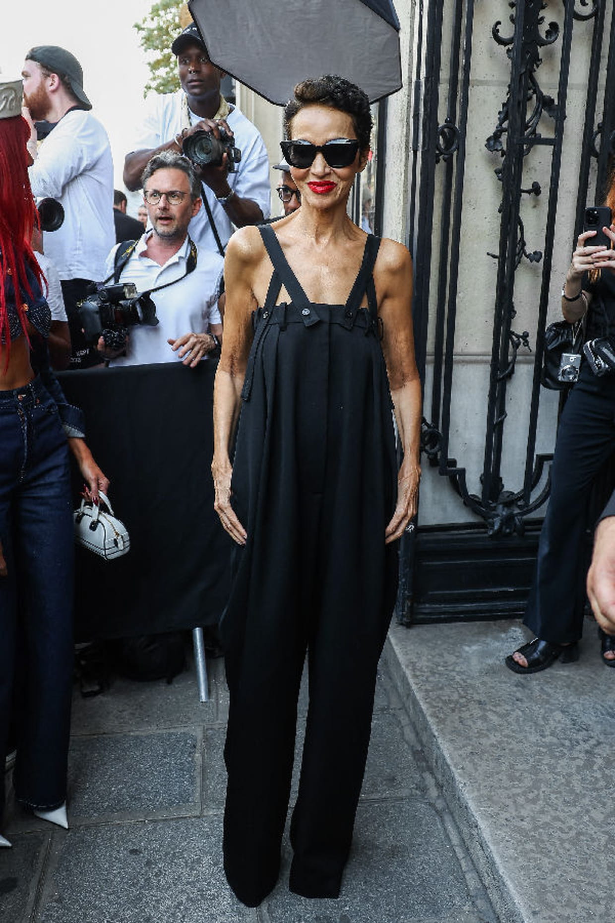Farida Khelfa en salopette XXL noire au défilé Jean-Paul Gaultier pendant la fashion week haute couture automne-hiver 2024-2025 à Paris le 26 juin 2024.