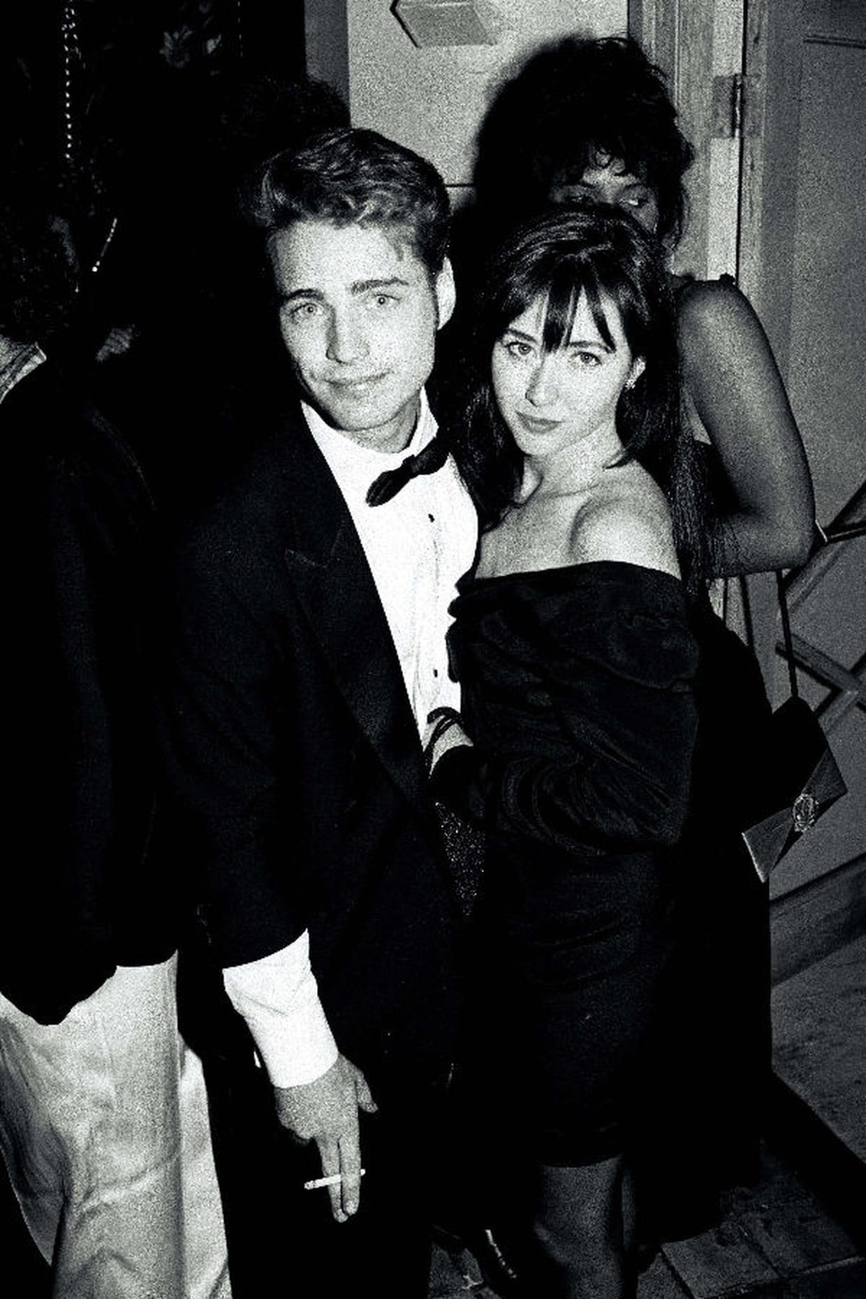 Shannen Doherty en robe noire à encolure Bardot avec Jason Priestley lors d'une soirée Fox TV à Spago le 25 août 1991.