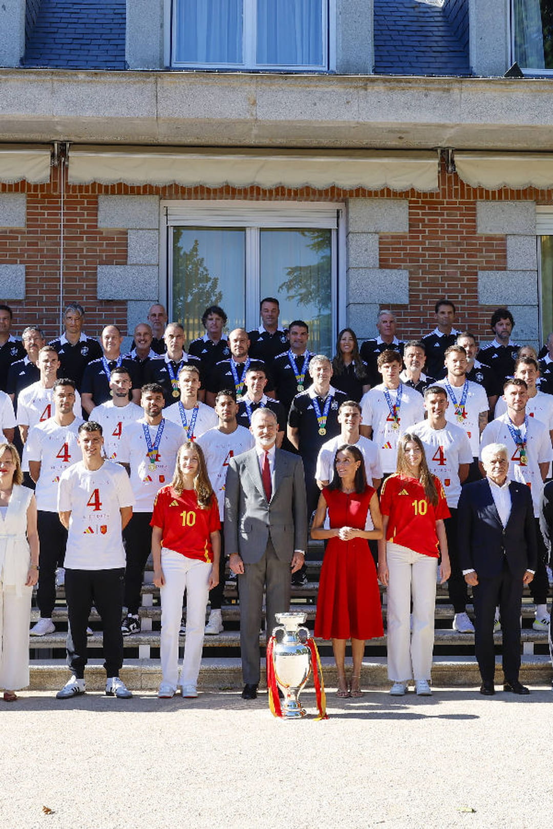 L'Espagne, quadruple championne d'Europe ! Dimanche 14 juillet 2024, tandis que les Français étaient affairés à admirer les feux d'artifices de la fête nationale, les Espagnols étaient occupés à célébrer la victoire de leur pays à la finale de la coupe d'Europe de football. Pour célébrer leur tout nouveau titre, les sportifs se sont rendus à Madrid, le 15 juillet 2024, où ils ont été reçus par la famille royale en personne. Alors que le roi Felipe VI portait un costume gris et une cravate rouge en hommage à la couleur de son pays, la reine Letizia avait misé sur une robe longueur genoux, rouge vif elle aussi.