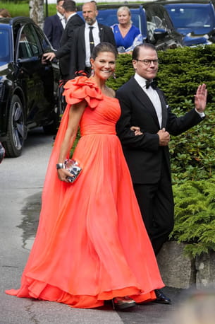 Victoria et Daniel de Suède étaient invités au mariage de la princesse Märtha Louise de Norvège ce samedi 31 août. Pour l'occasion, la tête couronnée s'est distinguée par son élégance en portant une robe asymétrique corail. Un fleur XXL trônait d'ailleurs sur son épaule. Pour la touche finale, elle a opté pour des talons argentés assortis à sa pochette.
