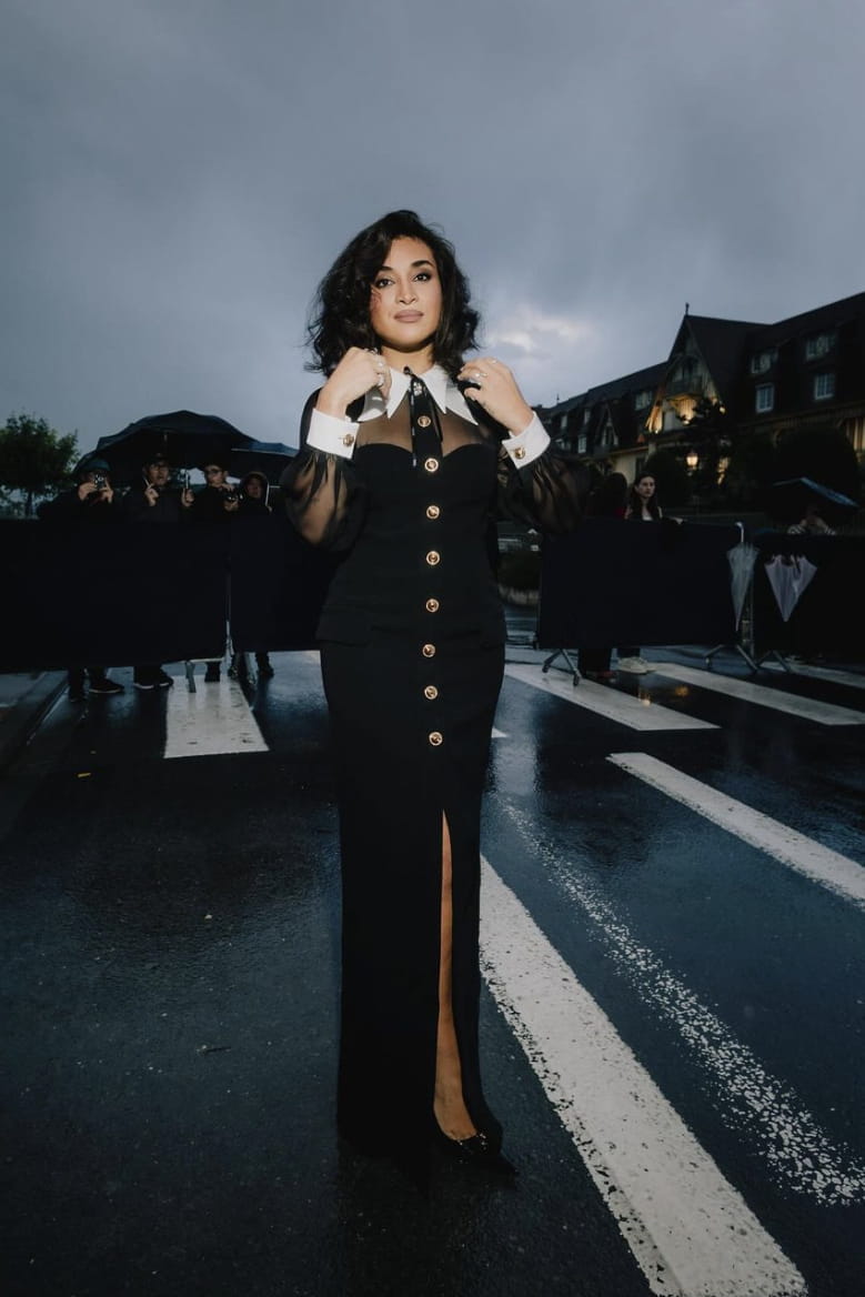 Sur son compte Instagram, Camélia Jordana vient de partager des photos de son arrivée au festival du film américain de Deauville et elle n'a pas manqué d'attirer l'attention des internautes. La raison ? Elle est resplendissante dans une longue robe noire, décorée de boutons dorés, dont les manches et le buste sont transparents. Le col et les manchettes, eux, sont blancs pour donner un effet chemise. Canon !