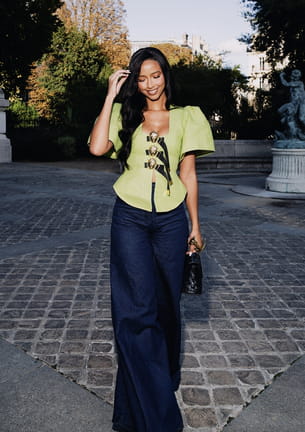 Flora Coquerel enchaîne les apparitions mode en cette Fashion Week parisienne ! Le 28 septembre dernier, c'était au défilé Elie Saab qu'elle a été repérée dans un top structuré vert anis, aux manches ballons, attaché par des brides sur lesquelles apparaissent des masques dorés. Associé simplement à un pantalon en denim extra large, l'ancienne Miss nous a livré une belle leçon de style.