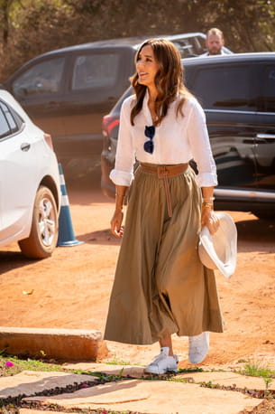 Le temps d'une visite officielle de quatre jours, Mary de Danemark a posé ses bagages au Brésil. Dimanche 6 octobre dernier, c'est en visitant un jardin botanique qu'elle a été aperçue avec une chemise blanche en lin rentrée à l'intérieur d'une longue jupe vaporeuse kaki. Pour parachever son look, la tête couronnée avait souligné sa taille d'une ceinture nouée marron et avait chaussé une paire de baskets Adidas pour une allure dans l'air du temps.