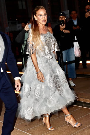 Présente au New York City Ballet 2024 Fall Fashion Gala, Sarah Jessica Parker était à couper le souffle dans une robe de cocktail à épaules dénudées. Cette pièce comportait un corsage ajusté, un châle transparent et une jupe confectionnée en tulle, avec des fleurs de différentes tailles. Pour rester dans le thème, l'actrice portait des accessoires argentés, y compris des sandales à talons, un sac recouvert de cristaux et des bijoux étincelants.