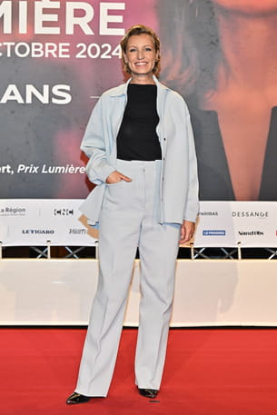 À l'occasion de la cérémonie d'ouverture du festival Lumière, Alexandra Lamy a brillé par son sens du style ! En effet, elle était vêtue d'un ensemble bleu clair parfaitement approprié à l'événement. Celui-ci se composait d'une veste ouverte sur un top noir et d'un pantalon droit. À ses pieds, la star avait enfilé des bottines ornées d'une plaque en argent au bout.