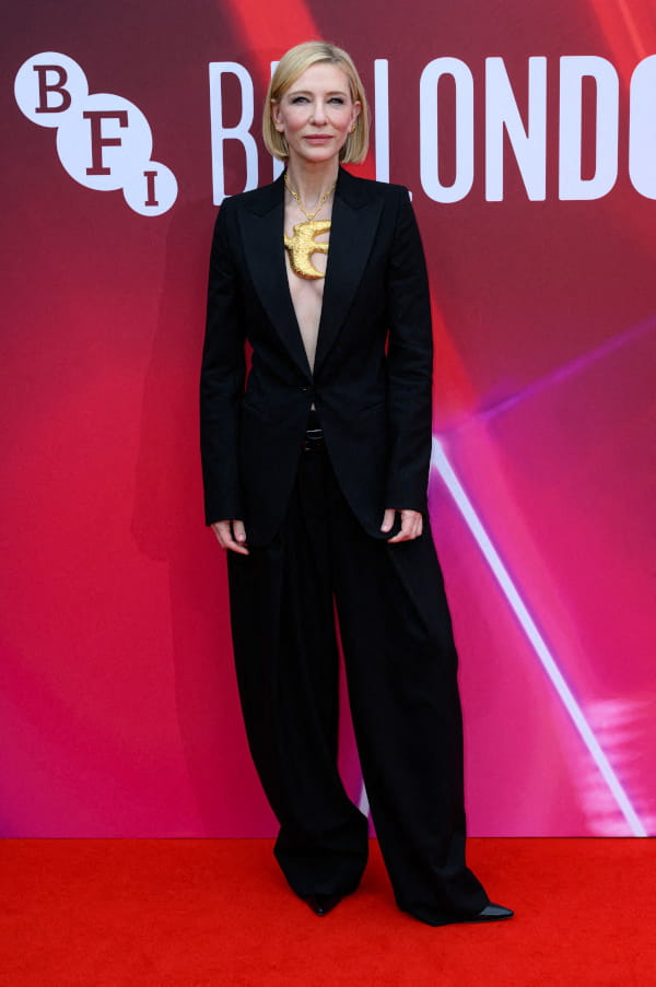 Icône de l'élégance, Cate Blanchett a une fois de plus captivé l'attention lors du 68e Festival international du Film de Londres, arborant un costume noir marqué par une veste de blazer qu'elle portait sans rien en dessous et un pantalon évasé. Mais ce qui a véritablement volé la vedette, c'était le collier XXL en forme d'hirondelle qu'elle portait autour du cou.
