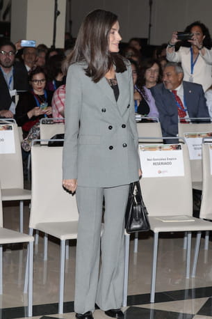 Letizia d'Espagne était aux premières loges de la Journée mondiale de la santé mentale, organisée à Madrid, ce jeudi 17 octobre. À l'occasion de son discours, la reine est apparue dans un costume Mango à la nuance grise. Son ensemble se composait d'un blazer à double boutonnage et d'un pantalon évasé. En dessous, elle portait un top avec une encolure en dentelle qui apportait une touche de féminité.