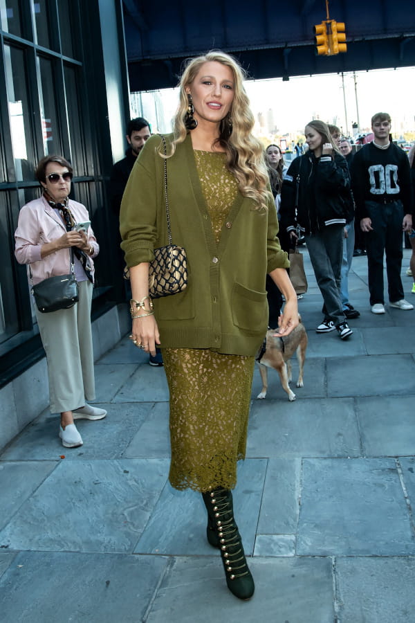En se rendant au festival Food and Wine à New York, Blake Lively a fait sensation habillée d'une robe en dentelle issue de la collection printemps 2025 de Michael Kors. Pour ajouter une touche casual, l'actrice avait superposé un cardigan assorti à la couleur vert olive de sa robe. Les accessoires, eux, se composaient de boucles d'oreilles en écaille de tortue, d'un sac Chanel et de bottes en daim Christian Louboutin.