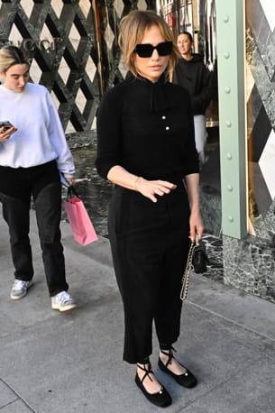 Le 20 octobre dernier, pour une virée dans les rues de Los Angeles, Jennifer Lopez avait misé sur un léger pull noué au niveau du cou avec un pantalon effet ballon. Côté accessoires, elle portait une large paire de lunettes de soleil, un mini sac à main et de sublimes ballerines à lacets. Un total look noir qui allait à ravir à l'interprète de On The Floor.