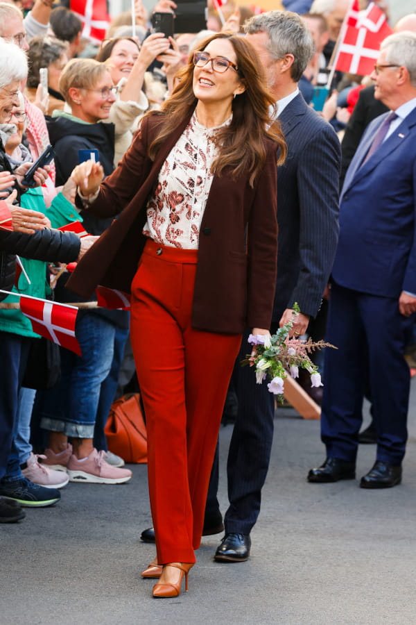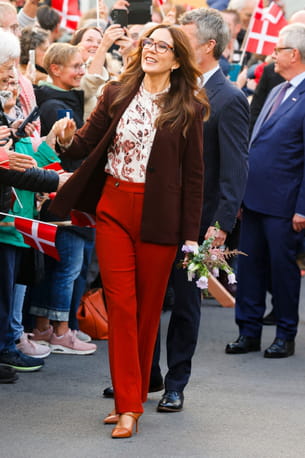 Lors de la deuxième journée de sa visite d'État en Allemagne, le 22 octobre dernier, Mary de Danemark nous a offert une silhouette chic et moderne en associant un pantalon écarlate avec un chemisier imprimé du même ton. Pour achever son look, elle avait simplement enfilé un blazer marron foncé et pris de la hauteur grâce à des talons à brides camel. Une association de couleurs réussie !