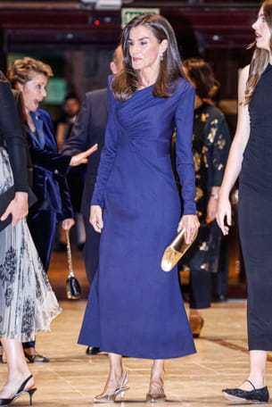 Letizia d'Espagne a encore une fois dévoilé tout son savoir-faire mode au concert annuel des Asturies à Oviedo, le jeudi 24 octobre. Pour l'occasion, elle portait une impressionnante robe bleu foncé sculpturale. Le vêtement arborait un drapé asymétrique au niveau du col, apportant un effet glamour. Côté accessoires, une pochette dorée et des slingbacks de la même couleur venaient compléter son allure chic à souhait.