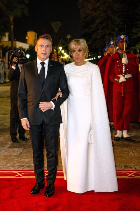 C'était à l'occasion du dîner d'État organisé par le roi Mohammed VI ce mardi 29 octobre au Palais Royal de Rabat. La Première dame française a décidé d'arborer une longue robe blanche ornée de cristaux. Et ce n'est pas tout ! Brigitte Macron portait une cape pailletée assortie, qui ressemble à celle aperçue au défilé Dior haute couture automne-hiver 2023-2024 !