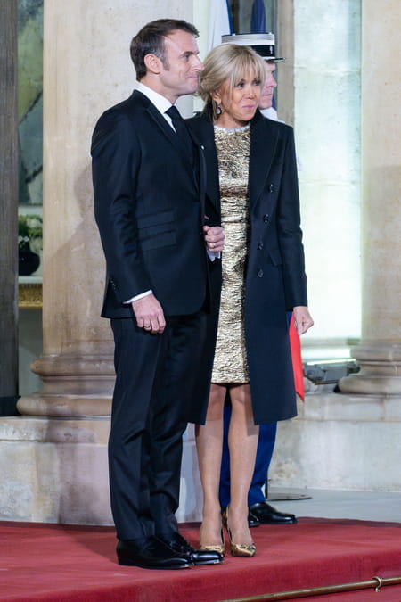 En effet, Brigitte Macron a exceptionnellement décidé de changer de look. Si la septuagénaire a l'habitude de porter du noir, du blanc ou encore du bleu marine, cette fois-ci, elle a décidé d'arborer le doré qui lui va d'ailleurs parfaitement au teint ! Elle était vêtue d'une robe courte en or métallique, au col brodé de pierres. Ses escarpins étaient assortis à sa robe, tout comme ses boucles d'oreilles et sa bague, qui avaient une petite touche dorée !