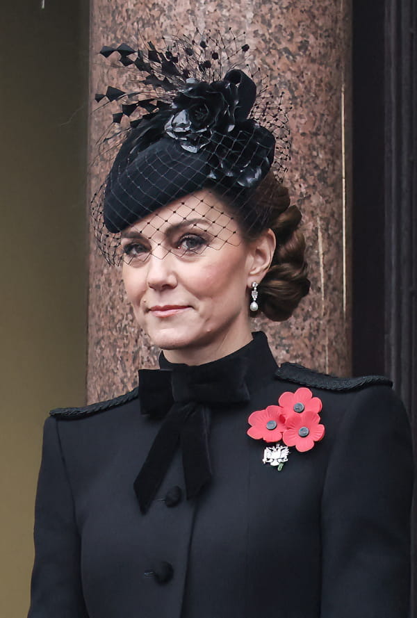 Le 10 novembre dernier, Kate Middleton était extrêmement sophistiquée pour assister à la cérémonie du Remembrance Sunday. Au programme de son look ? Un manteau noir accessoirisé d'une broche avec trois coquelicots et un bibi doté d'une gracieuse voilette qui habillait somptueusement le visage ainsi que le chignon latéral de la princesse. La tenue idéale pour ce moment de recueillement national.