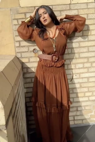 Exit les looks élégants et sexy, Salma Hayek a opté pour une robe marron au style bohème dans sa dernière vidéo Instagram filmée sur les toits de New York. Une tenue qu'elle a accompagné d'une ceinture, marron également, pour marquer la taille. La star est également venue ajouter un peu de brillance à sa tenue en habillant son poignet d'une manchette dorée et en arborant des colliers du même ton.