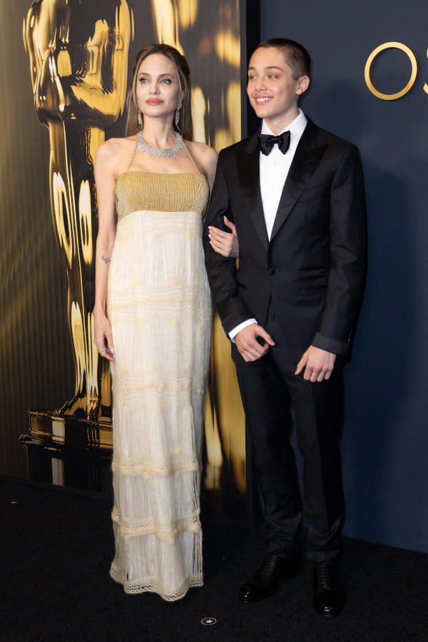 Alors qu'Angelina Jolie assistait aux Governors Awards, le 17 novembre dernier, aux côtés de son fils Knox, elle a laissé tout le monde sans voix avec un look éblouissant. La star était tout simplement époustouflante moulée dans une longue robe The Kit vintage, mélangeant dentelle délicate et maille dorée. Sans oublier la parure qui sublimait son cou ainsi que ses oreilles.