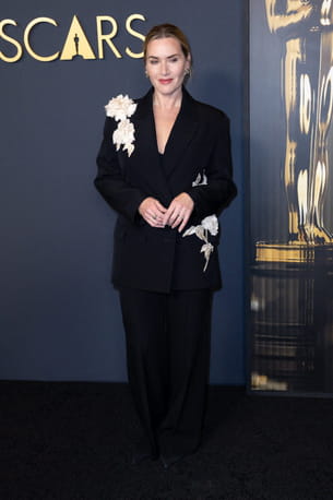 Kate Winslet a fait preuve de chic et de raffinement lors de la cérémonie des Governors Awards, qui s'est tenue à Los Angeles le 17 novembre dernier. Elle était vêtue d'un tailleur noir discret, dont la veste de blazer était rehaussée de fleurs blanches à la fois brodées et en 3D. Côté accessoires, elle n'a pas fait l'impasse sur les bijoux et portait une paire d'escarpins noirs.