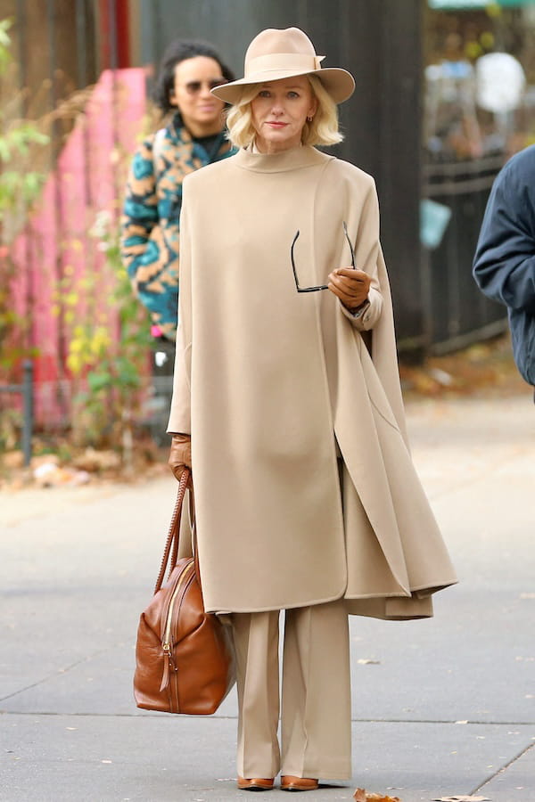 Repérée dans les rues de New York, en train de filmer All's Fair, le 20 novembre dernier, Naomi Watts était resplendissante dans un look totalement beige au summum de l'élégance. Pour l'occasion, elle portait un manteau cape beige associé à un pantalon droit dans le même ton et à un chapeau Fedora. Dans ses mains, recouvertes de gants en cuir camel, la star tenait un fourre-tout assorti.