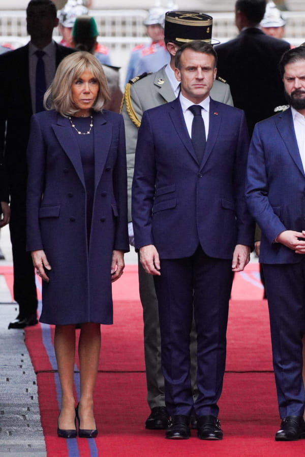 Arrivée au Chili, le 20 novembre dernier, pour son voyage d'Etat en Amérique du Sud avec son époux, Brigitte Macron a retenu l'attention avec sa classe incontestée. Elle était resplendissante, toute vêtue de bleu foncé, avec une robe droite tombant au-dessus du genou, un manteau en laine cintré et des escarpins vernis à bouts pointus. Un ensemble uni de Louis Vuitton qui faisait ressortir son collier en argent.