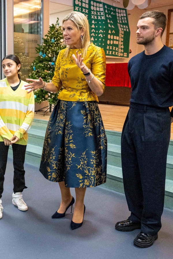 Ce mercredi 27 novembre, Maxima des Pays-Bas était à l'école Emmaüs de Rotterdam pour une visite surprise. C'est à cette occasion qu'elle a été photographiée portant une tenue à l'imprimé fleuri bien vintage. Signée Natan Couture, celle-ci se composait d'un top jaune moutarde aux manches trois quarts, resserré par une ceinture fine, et d'une jupe corolle bleu canard.
