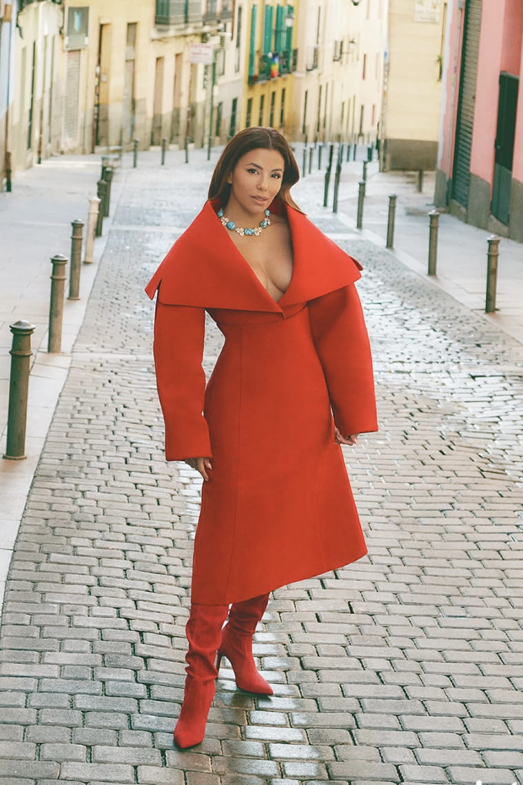 Eva Longoria a partagé sur son compte Instagram l'un de ses shootings photos préférés de l'année avec le magazine Marie Claire. Dessus, elle éblouit dans un total look rouge. Celui-ci était composé d'une robe sculpturale qui comportait un col surdimensionné, laissant apparaître sa poitrine, mais aussi des manches XXL. Avec, elle affichait des bottes assorties et un collier bleu et blanc.