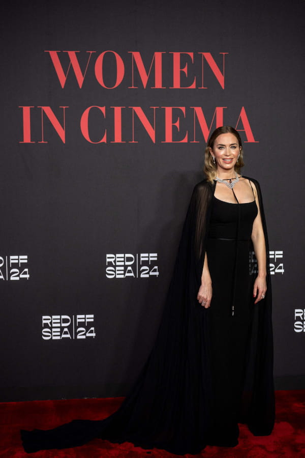 Le 6 décembre dernier, Emilie Blunt s'est démarquée avec une silhouette sombre lors du festival international du film de la Mer Rouge, en Arabie Saoudite. En effet, elle avait choisi de revêtir un total look noir constitué d'une robe aux bretelles fines et d'une cape, toute aussi longue, faite dans un tissu transparent. Côté bijoux, une parure de diamants venait compléter sa tenue élégante.