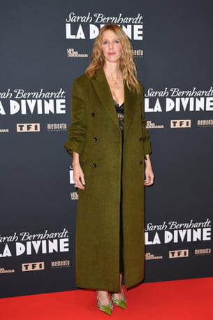 Lors de la présentation de son tout nouveau film Sarah Bernhardt, La Divine, le mardi 10 décembre, Sandrine Kiberlain est apparue plus stupéfiante que jamais en body noir en dentelle et au décolleté pigeonnant porté sous un long manteau vert olive. Aux pieds, une paire d'escarpins à brillants assortis et le tour était joué pour un look sexy et sage à la fois.