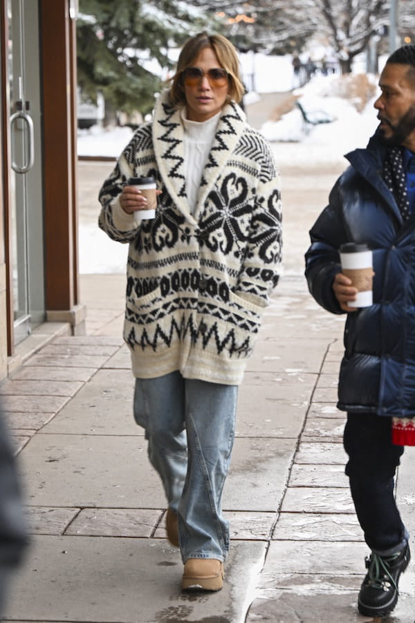 Jennifer Lopez enchaîne les propositions mode audacieuses et ce jeudi 26 décembre n'a pas fait exception. De passage à Aspen pour quelques jours, la bomba latina a été repérée dans un pull blanc col montant surmonté d'un cardigan imprimé en laine, porté avec un jean large aux coutures apparentes mais aussi avec une paire de Ugg à plateforme aux pieds et des lunettes de soleil rétro sur la tête.
