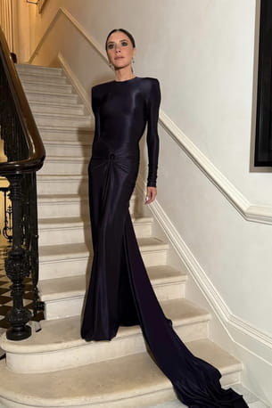 Aperçue sur Instagram, Victoria Beckham s'est affichée dans une robe noire sculpturale à l'occasion de Noël. Issue de sa propre marque, la création possédait un col rond, des épaules marquées, un effet froncé sur les hanches, une délicate traîne et un fini légèrement satiné qui attirait toute la lumière. Ce modèle profondément élégant allongeait sa silhouette et lui offrait une taille de guêpe.