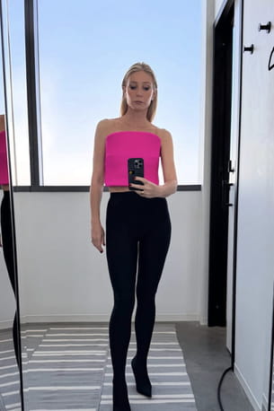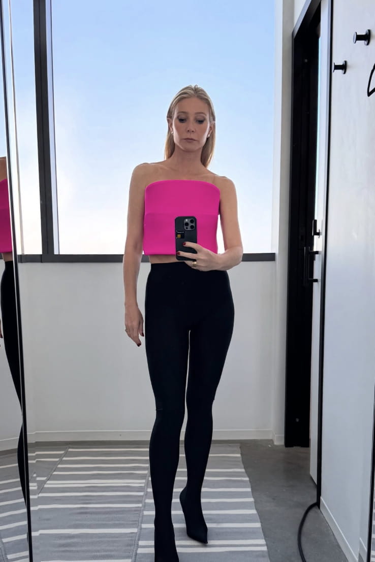 Sur Instagram, Gwyneth Paltrow a posté un recap' photos de son année 2024. Sur l'une de celles-ci, la star apparaît dans des cabines d'essayages Balenciaga vêtue d'un bustier rose fuchsia. Mais ce qui a réellement attiré l'attention, c'est son pantashoe, un legging qui fait également cuissardes pour ajouter une touche ultra pointue à la silhouette.