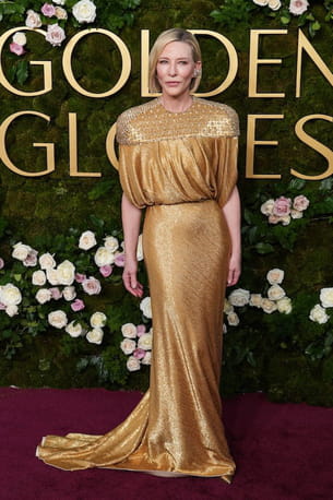 Cate Blanchett a fait une apparition remarquée à la cérémonie des Golden Globes, habillée d'une robe dorée Louis Vuitton. Un modèle sur-mesure composé d'un haut blousé, d'une jupe fluide et d'une petite traîne. En revêtant cette robe, la star a choisi de recycler sa tenue du festival de Cannes 2024. Seule différence : des cristaux ont été ajoutés sur le col et les épaules pour encore plus de dimension.