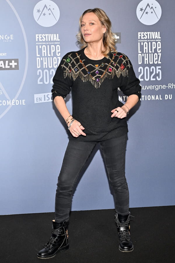 Venue assister à la projection du film L'Amour c'est surcôté qui se déroulait le 14 janvier dernier au Festival international du film de comédie à l'Alpe d'Huez, Caroline Vigneaux en a profité pour dégainer son pull beau pull d'hiver : un modèle noir brodé de pierres, de franges et de strass. Pour aller avec, l'humoriste a misé sur un jean slim et des combat boots.