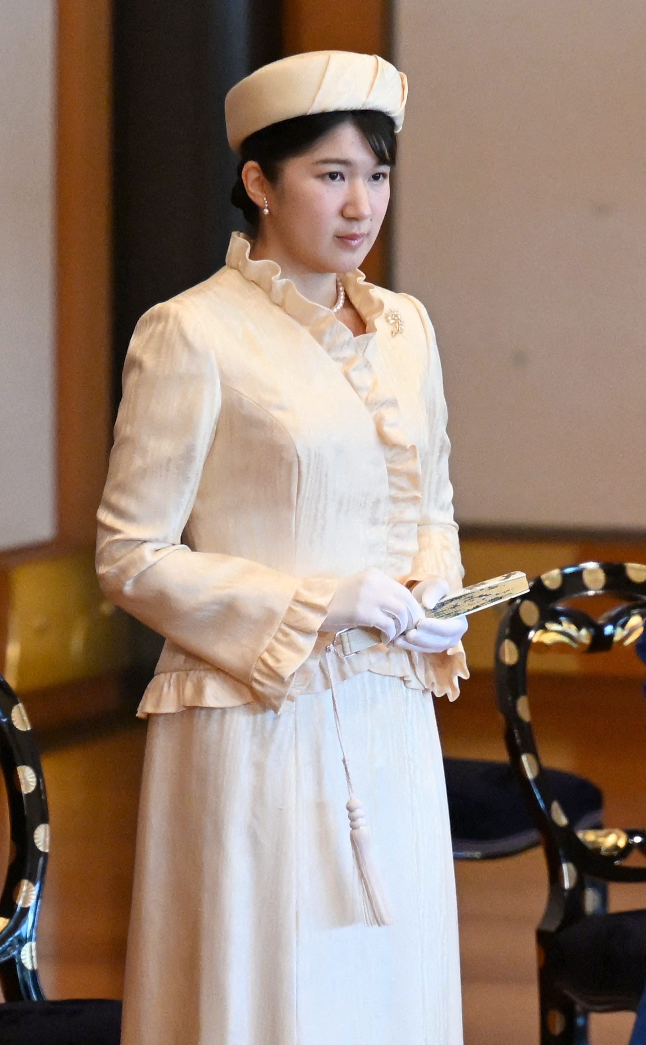 Mercredi 22 janvier, la princesse Aiko du Japon était présente pour la première fois lors de la cérémonie de lecture de poèmes pour la nouvelle année. À cette occasion, elle a dévoilé un total look beige qui se composait d'une robe, d'une veste à froufrous, d'un chapeau tambourin très élégant et de gants blancs.