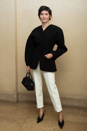 En look noir et blanc, Audrey Tautou est rayonnante au défilé Jacquemus