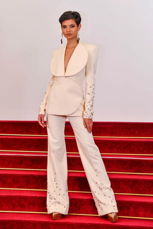 Au côté des plus grandes stars venues découvrir la collection Stéphane Rolland, Eve Gilles n'a pas demandé son reste en offrant un look époustouflant. En effet, elle n'avait rien à envier puisqu'elle est apparue en véritable femme fatale sur le tapis rouge. Pour l'événement, elle avait choisi un costume blanc au col XXL signé de la marque française. Un look monochrome et chic qui lui allait parfaitement bien.