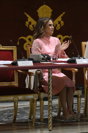 En robe rose en dentelle, Rania de Jordanie sort le grand jeu au Vatican