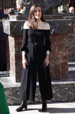 Letizia d'Espagne ose la combinaison jupe-culotte dans un total look noir et écru
