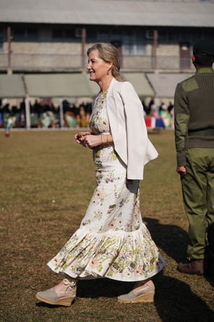 En visite d'Etat au Nepal, Sophie d'Edimbourg a dévoilé une énième robe à fleurs lors de la parade d'attestation à Pokhara, ce vendredi 7 février. Fidèle à ses looks chics, la duchesse avait choisi pour l'occasion un modèle à volants, brodé de fleurs roses et violettes, qu'elle a porté avec un blazer blanc sur les épaules. On remarque également ses sandales compensées de couleur beige qui lui donne beaucoup d'allure. De quoi faire rayonner la couronne britannique à l'international !
