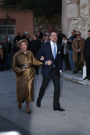 La reine Anne-Marie de Grèce joue la carte du look monochrome doré pour le mariage de son fils