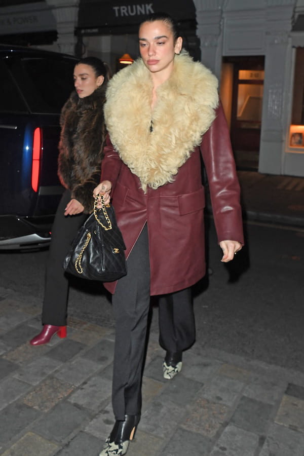 Dès qu'elle met un pied dehors, Dua Lipa fait rarement les choses à moitié côté look. Ce jeudi 13 février, elle a d'ailleurs été repérée dans les rues de Londres avec un manteau en cuir bordeaux et au col revers en fourrure. Il n'y a pas plus chic, confortable et tendance que cette pièce Y2K ! La chanteuse arborait également un top noir et un pantalon fuselé gris foncé. Une silhouette à son image, complétée par un sac Chanel matelassé et des bottines à talons imprimées d'un motif python sur le bout.