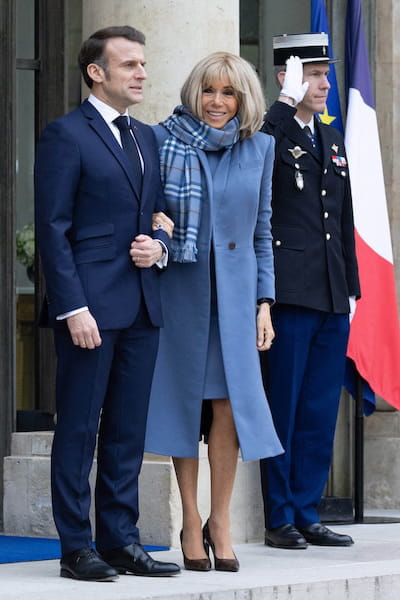 Pour accueillir le vice-président américain James David Vance et sa femme Usha Vance à l'Elysée, Brigitte Macron a opté pour un look monochrome bleu clair qui a fait son petit effet… Aux côtés d'Emmanuel Macron, elle est apparue avec une robe midi, un long manteau assorti et une écharpe tartan Burberry autour de son cou pour ne pas attraper froid. Afin de styliser davantage cette tenue chic et féminine, la Première dame l'avait associée à des escarpins à logo de Louis Vuitton.