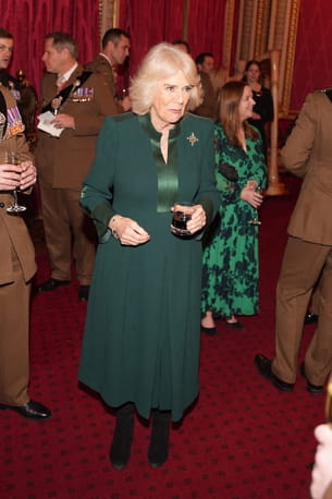 Ce mardi 11 février, la reine Camilla a mis les petits plats dans les grands pour accueillir des représentants militaires lors d'une réception au palais de Buckingham. Et niveau tenue, également, puisqu'elle portait une longue robe vert foncé avec un liseré en satin au niveau du col, des épaules et des manches longues. Sur le côté de celle-ci, on pouvait voir une broche en or sertie de diamants. Enfin, une paire de bottes en daim qu'elle a l'habitude de porter finalisait la silhouette avec style.