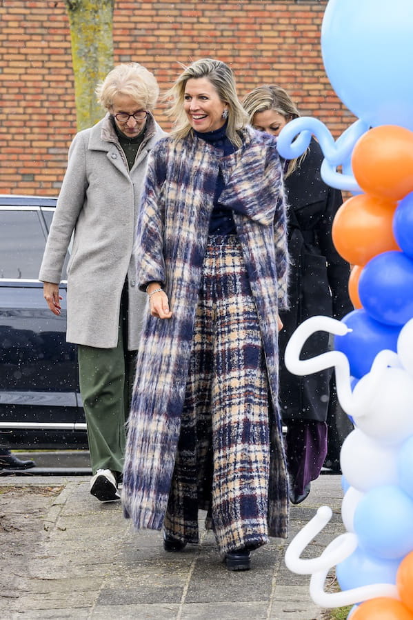Fidèle à ses looks audacieux, colorés et différents, Maxima des Pays-Bas a donné une nouvelle leçon de mode royale en visitant plusieurs écoles primaires d'Emmen, ce jeudi 13 février. Elle s'était alors façonnée une tenue exceptionnelle comprenant un manteau d'hiver mêlant imprimé à carreaux, maxi longueur, effet fourrure et nœud XXL sur l'épaule droite. Une pièce statement qu'elle portait avec un pantalon aux jambes larges assorti, un col roulé bleu marine et des bottes à plateforme de Gianvito Rossi.