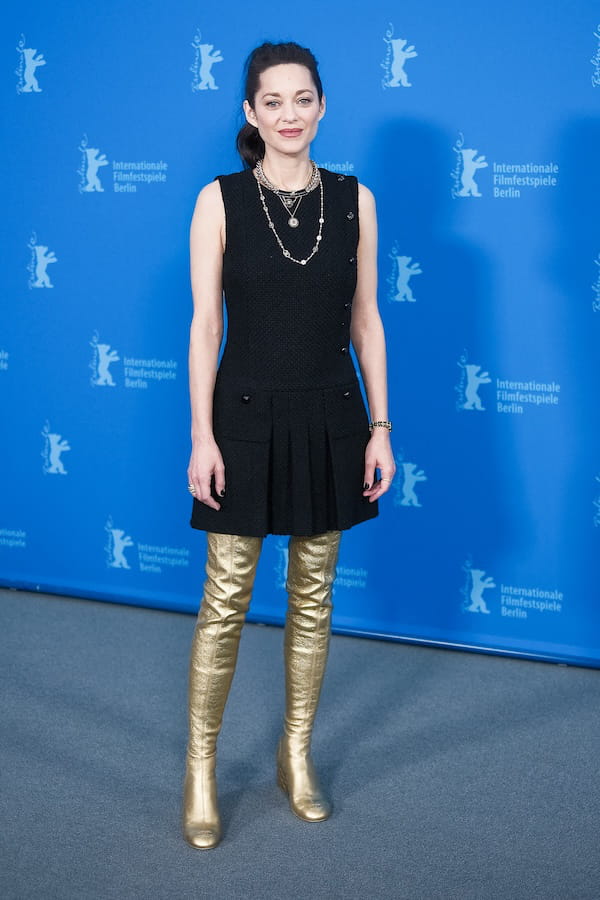 À l'occasion du photocall de La Tour de Glace au Festival du film de Berlin, Marion Cotillard a sorti le grand jeu, lovée dans une petite robe noire en tweed. Et afin de mettre en avant cette pièce élégante et chic, la star avait chaussé des cuissardes dorées aux talons compensés. Un total look choisi dans le vestiaire de la maison Chanel, dont elle est l'une des ambassadrices. À son cou trônait également une superposition de colliers de la griffe au double C.