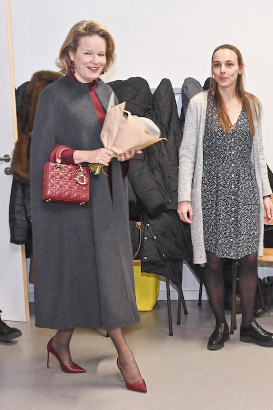 De passage au Collège Matteo Ricci d'Anderlecht pour une rencontre entre l'écrivaine Geneviève Damas et des élèves de 5eme, Mathilde de Belgique a été immortalisée dans un total look bordeaux. Elle s'est affichée pour l'occasion dans une robe satinée, des escarpins en cuir et le Lady Dior au bras. En vue de braver le froid hivernal, la reine avait parfait sa tenue d'un manteau-cape gris qui allait de pair avec le reste de la tenue. Un choix élégant, chic et ravissant.