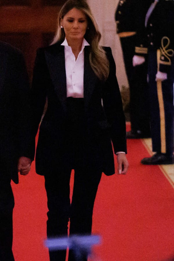 Pour un dîner organisé à la Maison-Blanche, ce samedi 22 février, Melania Trump est apparue comme à son habitude : plus élégante que jamais. La Première dame, qui a un style bien à elle, sait parfaitement comment se mettre en valeur. Pour cet événement mondain, Melania Trump avait choisi de porter un smoking noir associé à une chemise blanche afin de faire la paire avec son mari. Cette tenue de la marque Ralph Lauren, à l'esprit masculin-féminin se composait d'un blazer en velours aux larges épaulettes et d'un pantalon à pinces.