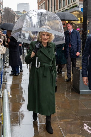 La reine Camilla brave la pluie avec un manteau pile dans la tendance