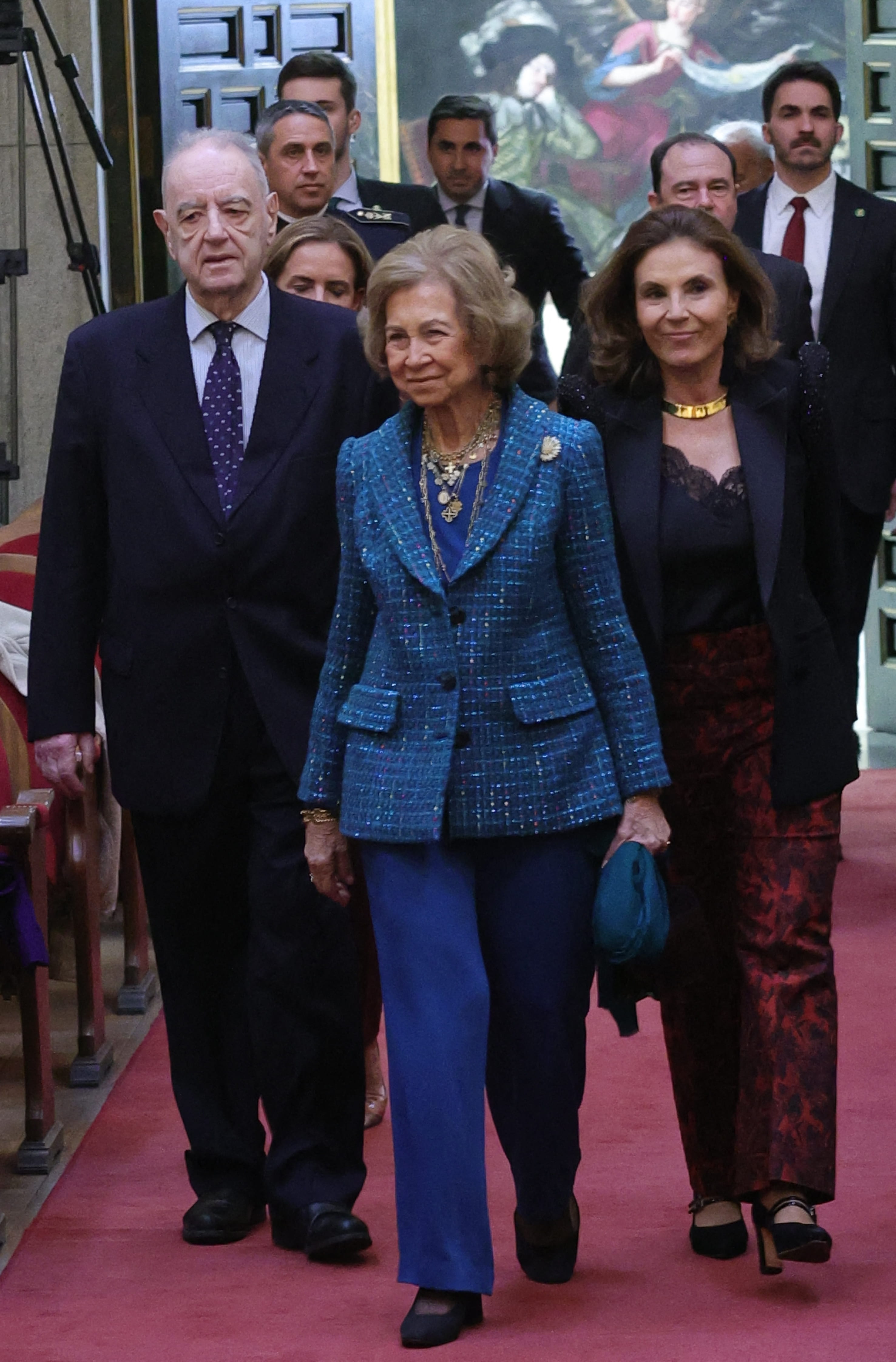 Lundi 3 mars, la reine Sofia d'Espagne était à Madrid pour présider la remise des prix du Patronage Ibéro-Américain à l'académie royale des Beaux-Arts. Pour cet événement culturel, la reine a choisi de se vêtir que de bleu. Une nuance lumineuse qui s'accordait parfaitement avec son teint légèrement doré. Elle a donc sorti de son dressing royal, un pantalon habillé et une veste en tweed irisée. Un détail mode qui rehausse n'importe quelle tenue instantanément. Visiblement, le sens du style est une affaire de famille !
