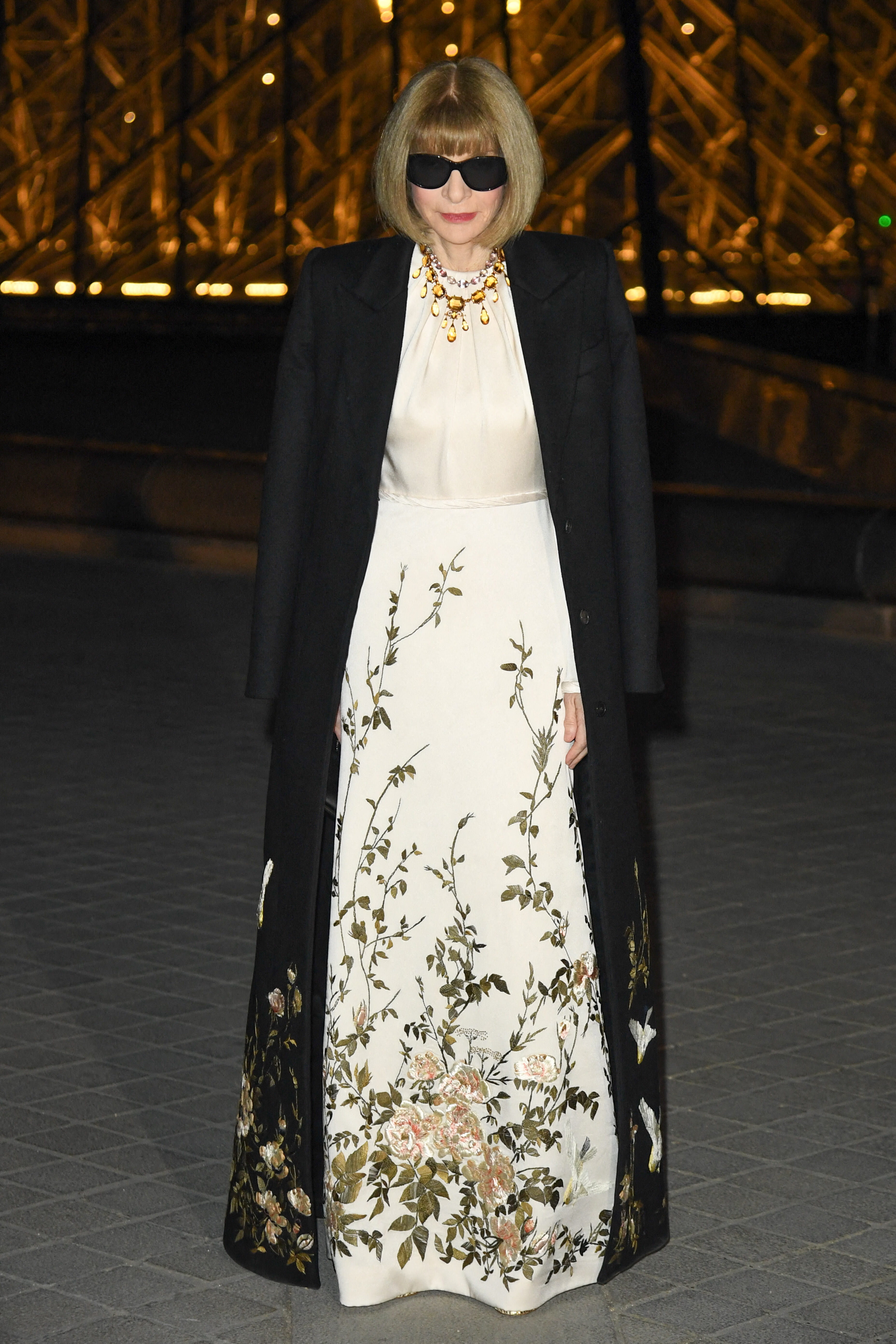 Anna Wintour était présente lors du Dîner de la Mode organisé par le Louvre, visant à récolter des fonds pour le musée parisien. Pour cet événement hors du commun, la prêtresse de la mode a choisi d'afficher une maxi robe blanche resserrée à la taille avec de magnifiques fleurs brodées sur la jupe. Pour l'accompagner, elle avait opté pour un manteau long, également orné de fleurs. Non seulement, cette pièce luxueuse conférait du raffinement à son look, mais elle semblait lui apporter également un sérieux coup de jeune !