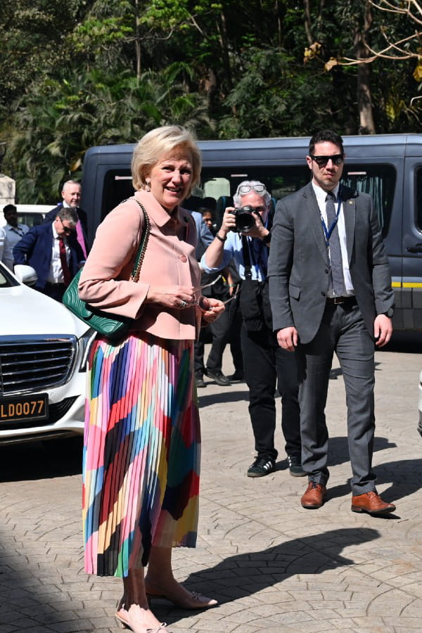 Mercredi 6 mars, la princesse Astrid de Belgique a visité le zoo de Mumbai en Inde. Pour l'occasion, elle s'est affichée avec un look original dans la lignée des derniers jours. Exit la tenue jaune canari monochrome, la princesse a opté cette fois pour des pièces ultra-colorées et audacieuses. En effet, elle a choisi de sortir de son dressing royal une jupe plissée multicolore qu'elle a associé à une veste rose pâle rehaussée d'une broche à strass représentant une carotte. Côté accessoires, elle avait jeté son dévolu sur un sac à main vert de la marque Gucci.
